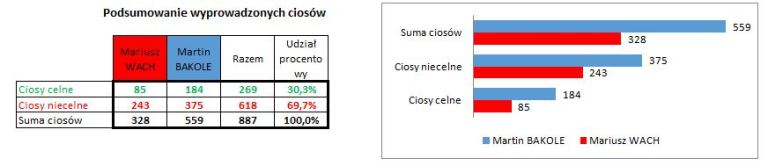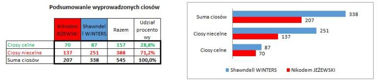 Szczegółowe statystyki walk zostały wysłane do organizatora gali. Z kolei na naszym profilu na Facebooku oraz Twitterze publikowałem ogólne podsumowania. Niestety z przyczyn od nas niezależnych nie mogliśmy zacząć testów od pojedynku Mateusza Rzadkosza z Tomaszem Gromadzkim. Szkoda. Pierwszą potyczką, w pewnym sensie dla nas historyczną, w której zliczaliśmy ciosy było starcie Damiana Wrzesińskiego oraz Kamila Młodzińskiego.