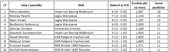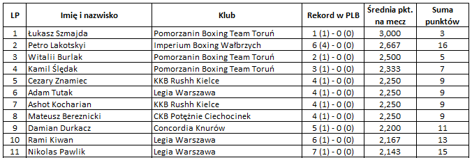 Czas na szczegóły rankingów. Liderem pod względem największej ilości punktów jest Petro Lakotskyi (Imperium). Tuż za nim, najlepszy z Polaków, Nikolas Pawlik (Legia). Najlepszą średnią na mecz posiada Łukasz Szajda (Pomorzanin), ale należy zaznaczyć, iż pięściarz z Torunia stoczył tylko jedną walkę. Tuż za nim wspomniany wcześniej Petro Lakotskyi.
